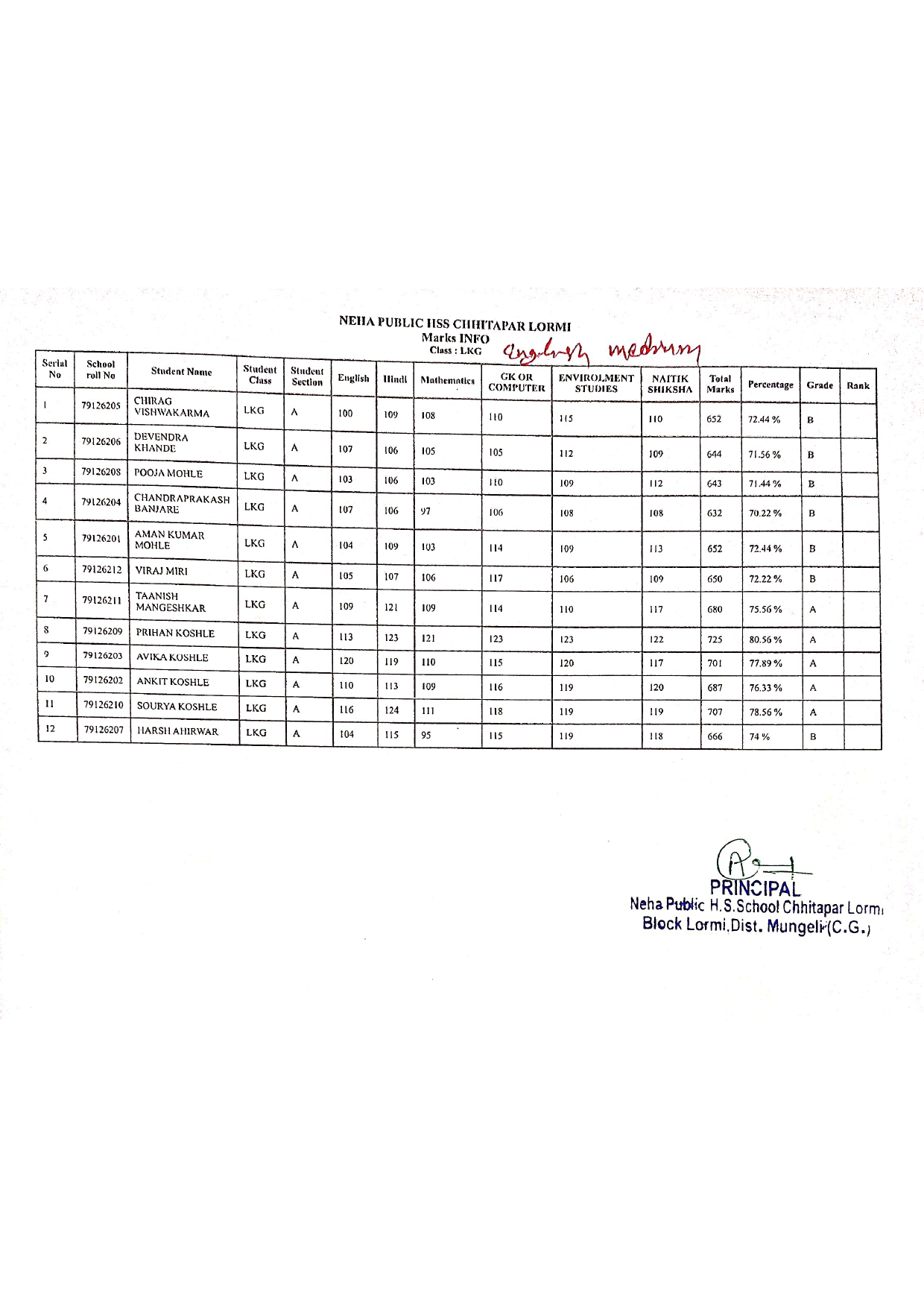 Class LKG Result (English Medium)